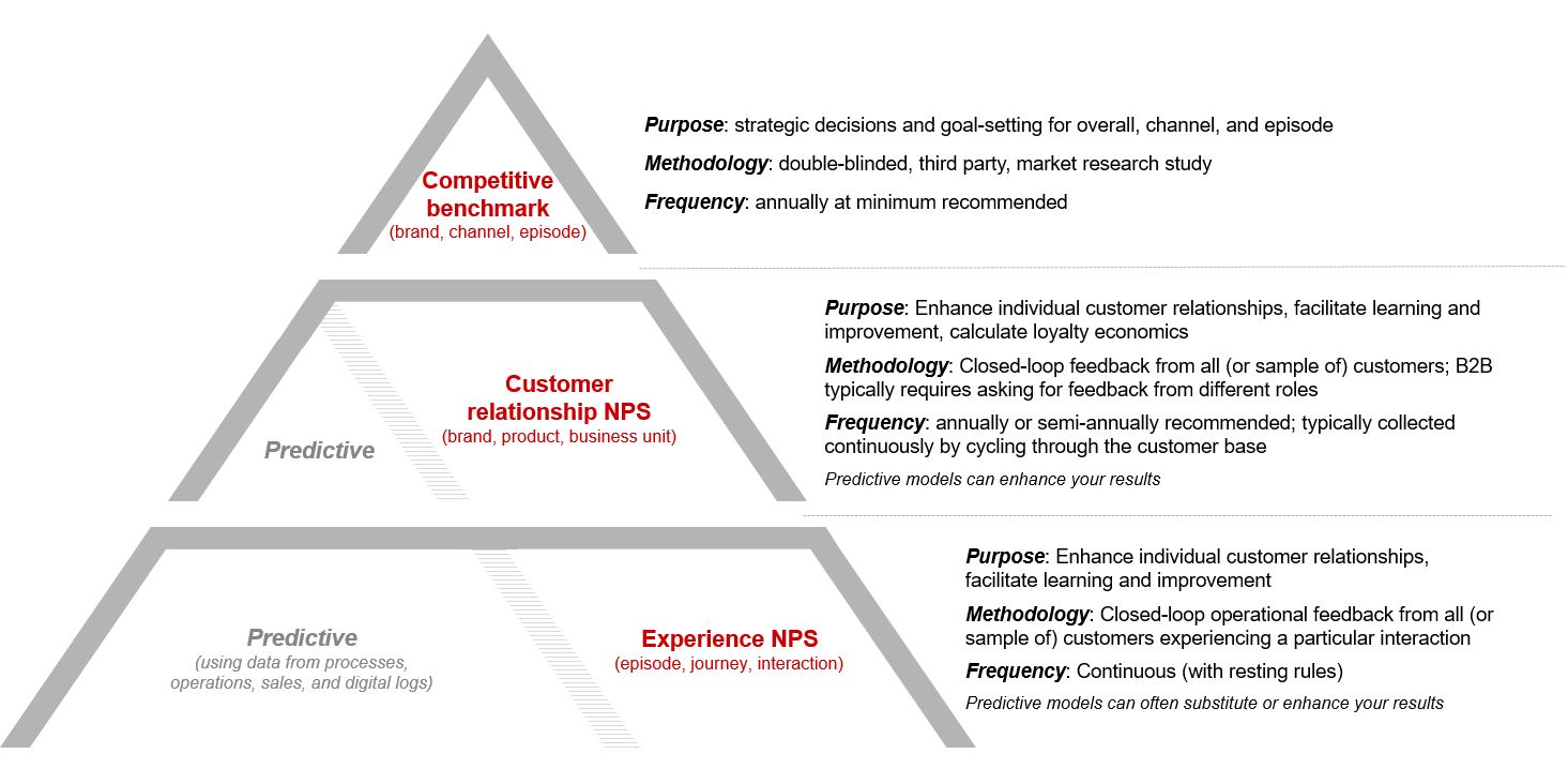 Seasoned practitioners of the Net Promoter System gather feedback from their customers in three different ways: competitive benchmark, relationship, and experience NPS.